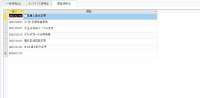 この画面は、設備に関するさまざまな履歴情報を登録したり、編集したりするための画面です。管理部門の変更や設備の移管・移設、改造、補用部品の手配先変更、大規模な補修履歴など、自由にその履歴を残しておくことができます。1つの設備について、事実上無制限の履歴を入力することができます。