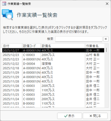 | 一覧検索 | この「作業実績入力」画面は1画面1件の単票形式になっているため、既存の特定の作業実績データを探すには、1画面ずつレコード移動していく使う必要があります。この検索機能は、入力されたすべての既存データの一覧の中から所定の実績データを探すための機能です。![]() この「作業実績一覧検索」画面では、項目を選択するたびに画面を閉じる必要はありません。開いたまま[表示]ボタンをクリックすることによって、あるいは選択項目をマウスでダブルクリックすることによって、その都度「作業実績入力」画面がそのレコードに移動します。 |