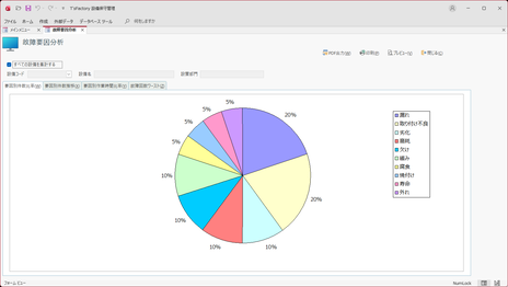 | 印刷 | 画面上の各タブの4つのグラフを1つにまとめて出力する「故障要因分析」帳票を直ちにプリンタに出力して印刷します。 |