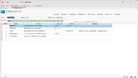 - 設備と保守区分を選択したら、画面下半分の表形式の画面に、”その設備とその保守区分”の定期保守作業の詳細手順を順番に入力していきます。ここでは、次の6つのデータを入力あるいは編集します。