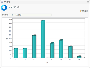 | タクト評価 | 現在画面表示されている端末番号について、進捗推移データを元にした「タクト評価」の結果をグラフ表示します。 タクト評価とは、1ケごとの実績カウントアップの“時間間隔”、つまり実績のタクトの分布を集計・グラフ化したものです。標準のタクトより時間の掛かっているものがどのくらいあるかが分かります。 ![]() ※進捗推移データの”直近の1000件から集計されます。それ以前は集計に含まれません。 |