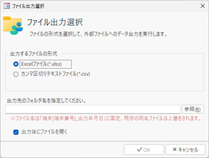 | ファイル | 現在画面表示されている端末番号の進捗推移データをExcelファイルあるいはCSVファイルに出力します。「ファイル出力選択」画面が表示されますので、ファイル形式をExcelファイル/CSVファイルのいずれかから選択するとともに、出力先のフォルダ名を[参照]ボタンなどによって指定してください。![]() ※「出力後にファイルを開く」にチェックマークを付けておくと、ファイル出力後に拡張子に関連付けられたアプリケーションが自動起動してそのファイルを開くことができます。 |