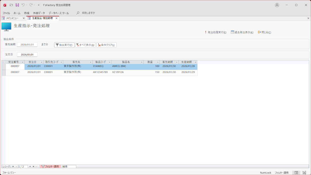 計算された生産や外注・購入品の納期に基づいて、受注番号・納期ごとに集計された生産指示や発注処理を行うことができます。