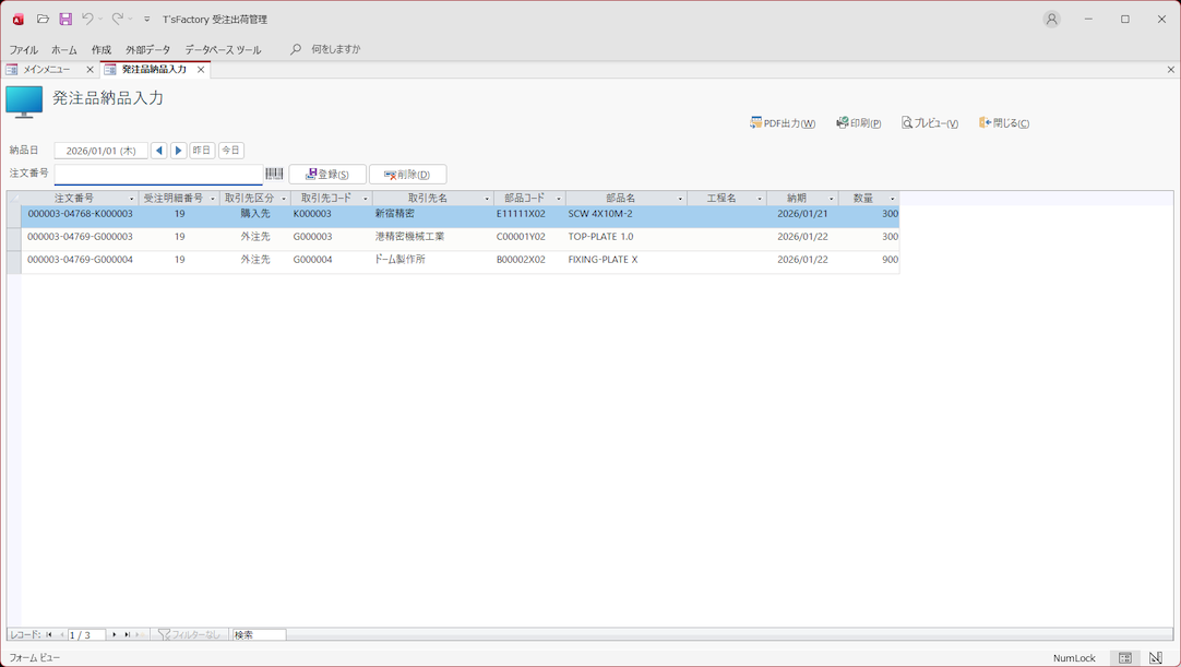 • 発注品納品入力