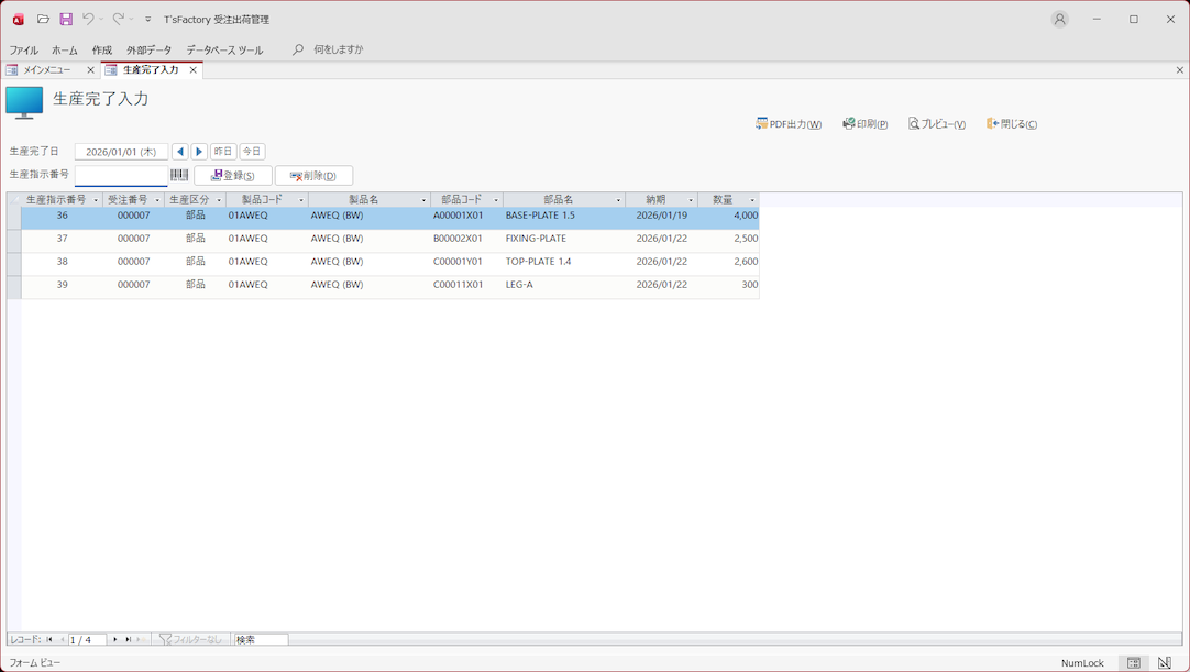 生産指示や発注を行ったあと、製品や部品の生産、あるいは部品の外注・購入について、その完了や納品済み等の実績情報を登録することができます。