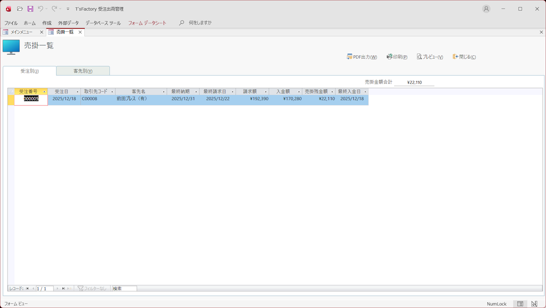 • 受注別売掛一覧表