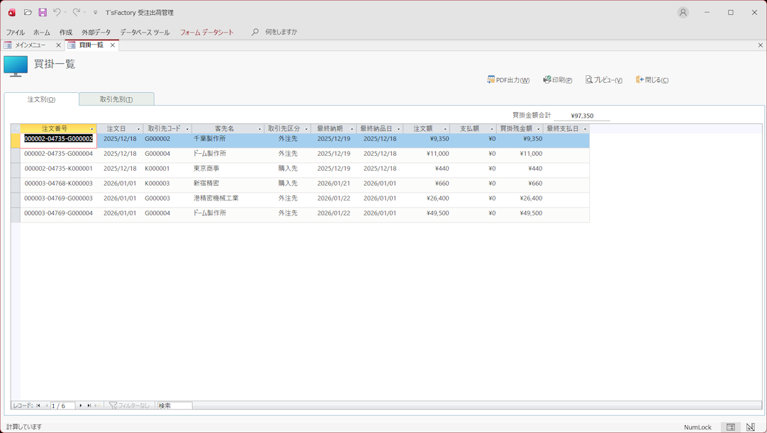• 注文別買掛一覧表