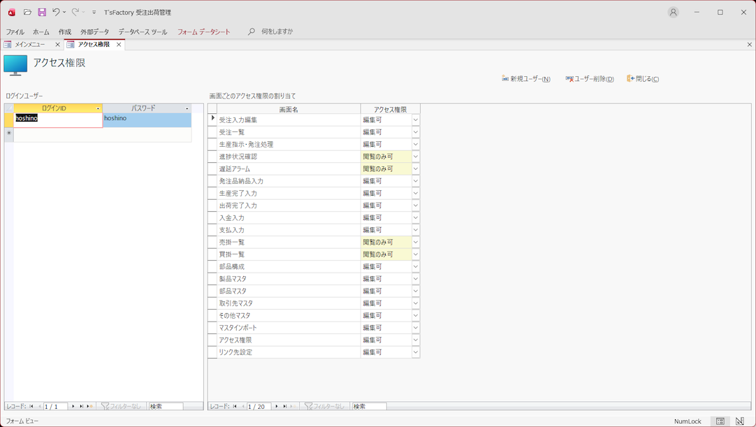 ユーザーごと・画面ごとに編集可/閲覧のみ可/使用不可の3種類のアクセス権限を設定・管理することができます。