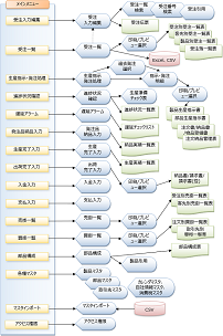 本アプリケーションで操作する、「メインメニュー」画面から表示される各画面のフロー、またそれに関連した帳票やファイルのフローの概要は以下の通りです。