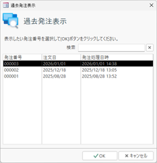 | 過去発注表示 | 生産指示・発注処理が実行済みとなった受注データは以降この画面には表示されなくなります。そのような、過去に処理した受注データについての「指示・発注明細」画面を表示するには、このボタンをクリックします。クリックすると次のようなダイアログが表示されますので、表示させたい発注処理の項目を選択して[OK]ボタンをクリックしてください。![]() |