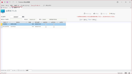 - それによって、その受注番号に関するデータ(受注日や客先名など)が画面上部に表示されるとともに、製品明細がその下の一覧表に表示されます。