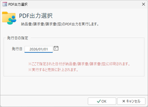| PDF出力 | 現在画面表示されている受注番号の「納品書/請求書/請求書(控)」をPDFファイルに出力します。このボタンをクリックすると次のような画面が表示されますので、「発行日」を指定したあと、[OK]ボタンをクリックしてください。![]() |