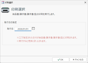| 印刷 | 現在画面表示されている受注番号の「納品書/請求書/請求書(控)」を印刷します。このボタンをクリックすると次のような画面が表示されますので、「発行日」を指定したあと、[OK]ボタンをクリックしてください。![]() |