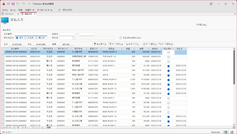 納品が完了し請求書を受領した外注品・購入品データに対して、支払を済ませたときにその実績データを入力する画面です。それによって買掛金の消し込みが行われます。
