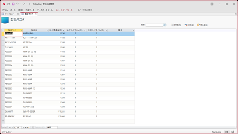 | 削除 | 現在カーソルがある1行を削除します。このボタンをクリックすると確認メッセージが表示されますので、削除してよければそのまま[はい]ボタンをクリックしてください。 ※製品マスタデータを削除した場合、その製品の部品構成データなどもいっしょに削除されます。また、他のT'sFactoryシリーズとデータ・データベースを共有している場合には、それらに関連したデータも同時に削除されます。一度削除すると元には戻せませんので、削除には十分注意してください。 |