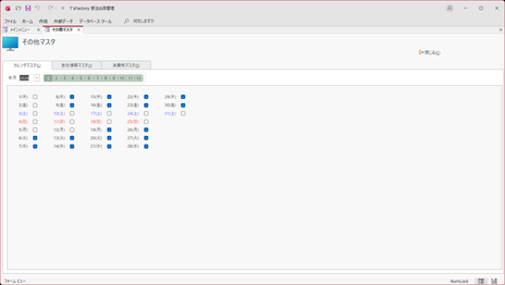 この画面は、「カレンダマスタ」・「自社情報マスタ」・「消費税マスタ」の3つのタブに分かれています。まずタブの標題部分をクリックして所定の画面に切り替えたあと、各データを適宜入力あるいは編集します。