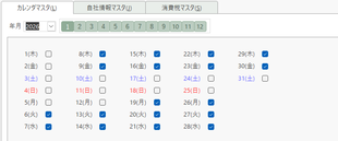 - 選択された年月の1〜31日それぞれについて、稼働日であればチェックマークを付けます。非稼働日(休日)であればチェックマークを外します。