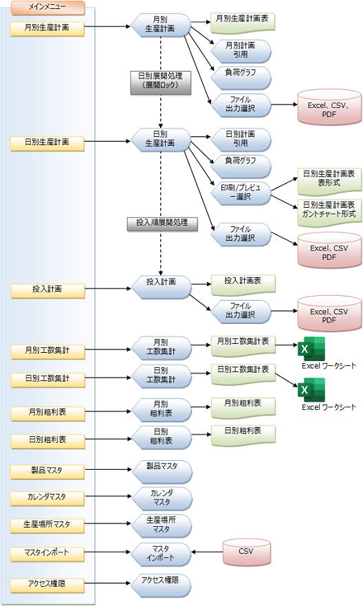 本アプリケーションで操作する、「メインメニュー」画面から表示される各画面のフロー、またそれに関連した帳票やファイルのフローの概要は以下の通りです。