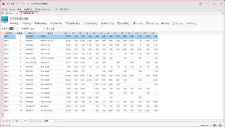 | PDF出力 | 現在画面表示されている生産年・生産場所の月別生産計画データを、「月別生産計画表」帳票としてPDFファイルに出力します。 |