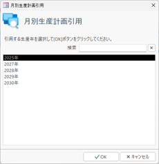 | 計画引用 | 画面上と同じ生産場所の、すでに登録されている他の年の月別生産計画データを引用します。他の年と同じような製品構成の計画を入力する際には、この機能を使うことによって、データ入力を省力化することができます。このボタンをクリックすると、すでに月別生産計画が登録されている、他の生産年が一覧表示されます。そこから引用元とする年を選択して[OK]ボタンをクリックします。実際に引用する際には、すでに現在の画面に入力されているデータはすべてクリアされてから引用されます。![]() |