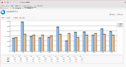| 負荷グラフ | 現在画面表示されている生産年・生産場所について、月別の負荷と能力のバランスをグラフとして対比表示します。「負荷」は月別生産計画の生産数量と製品ごとの標準時間(「製品マスタ」画面より入力)から算出されます。「能力」はカレンダマスタより月別の工数が算出されます。![]() |