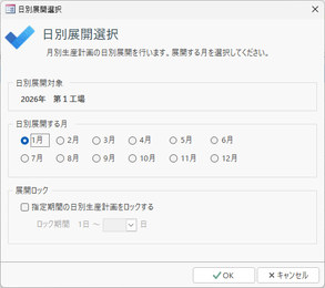 | 日別展開 | 入力された月別生産計画のうち、特定の月を指定して、それを日別の生産計画に自動展開します。展開の際には、負荷と能力のバランスを考慮し、できる限り負荷平準化された形の日程を作成します。 このボタンをクリックすると、まず「日別展開選択」画面が表示されます。今日現在の"翌月"が初期選択されていますが、必要に応じて展開したい月を選択したあと、[OK]ボタンをクリックしてください。なお、日別展開処理が完了すると、メインメニューに戻らなくても、直ちにその結果を画面表示することができます。 ![]()