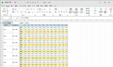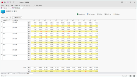 - 上記操作によって、指定された生産年の生産場所ごとの工数集計データが一覧表示されます。1つの生産場所について、負荷工数・能力工数・それらの差異が3段で表示されます。