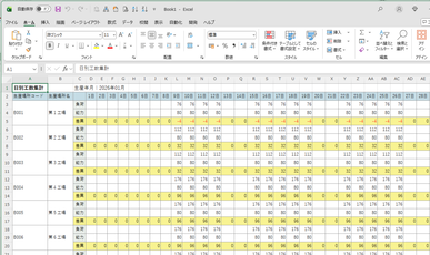 日別の生産計画に基づく負荷工数・能力工数・それらの差異を一覧表示する画面です。
