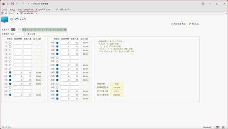- すでに生産カレンダを入力してある年月・生産場所を選んだ場合には、すでに入力済みの生産カレンダが表示されます。必要に応じて編集を行ってください。