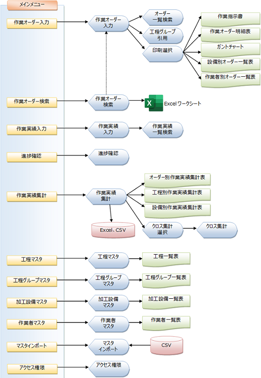 本アプリケーションで操作する、「メインメニュー」画面から表示される各画面のフロー、またそれに関連した帳票のフローの概要は以下の通りです。