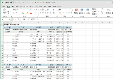 - 一覧表は左右に2つありますが、左の表が抽出結果である作業オーダーの一覧です。一方、右の表は、左の表で現在カーソルがある行のオーダーの工程の一覧が表示されています。左の表でレコード移動するたびに、右の一覧の内容も連動して切り替わります。