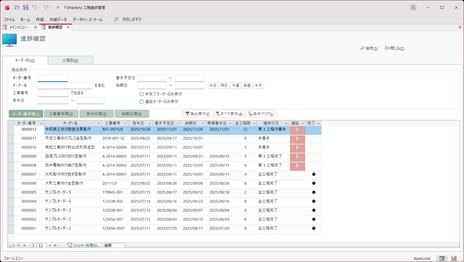 概要 「進捗確認」画面は、作業実績入力で登録された工程別の進捗状況をさまざまな形で抽出・表示する画面です。 この画面は、タブで2つの細かい画面に分けられています。2つのタブ内の画面概要や操作方法については、以下のそれぞれの説明をご覧ください。
