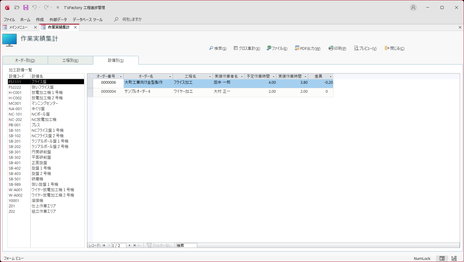 - この画面では、左に「加工設備一覧」のリストが表示されています。ここには「加工設備マスタ」画面から登録されたすべての加工設備が選択肢として一覧表示されています。この中から、作業実績集計結果を確認したい設備をマウスでクリックして選択します。