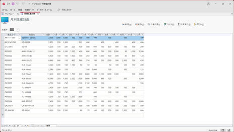- まだ生産計画をまったく入力していない年を選んだ場合には、新規レコードだけの画面が表示されます。「製品コード」を一覧から選択するとともに、各月の生産数量を入力していきます。その際、「製品名」と「合計」は自動的に表示されます。また、「製品コード」の一覧には、「製品マスタ」画面で入力され、かつ部品表データが登録されている製品だけが選択肢として一覧表示されます。もし必要な製品が表示されない場合には、「製品マスタ」画面および「部品表作成」画面に戻ってその両方の登録を行ってください。