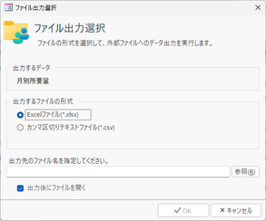 | ファイル | 現在画面表示されている月別所要量の計算結果をExcelファイルあるいはCSVファイルに出力します。「ファイル出力選択」画面が表示されますので、ファイル形式をExcelファイル/CSVファイルのいずれかから選択するとともに、出力先のファイル名を[参照]ボタンなどによって指定してください。![]() ※「出力後にファイルを開く」にチェックマークを付けておくと、ファイル出力後に拡張子に関連付けられたアプリケーションが自動起動してそのファイルを開くことができます。 ※「月別生産計画」画面の[ファイル]ボタンでも同様のファイル出力を行うことができます。 |
