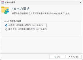 | PDF出力 | 現在画面表示されている月別所要量の計算結果を帳票形式でPDFファイルに出力します。部品別/購入先別の選択などの操作は[印刷]ボタンと同様です。![]() |