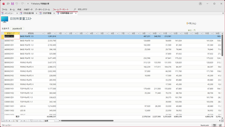 | 所要量日程 | 現在画面表示されている日別所要量の計算結果を元に、日付を縦に並べ、日ごとに部品名や数量を列挙するフォーマットに置き換えた「所要量日程表」帳票を画面上でプレビューします。![]() |