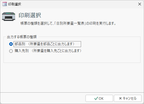 | 印刷 | 現在画面表示されている日別所要量の計算結果を帳票に印刷します。「印刷選択」画面が表示されますので、そこで部品別/購入先別の選択を行ってください。![]() |