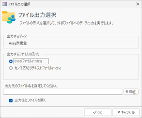 | ファイル | 現在画面表示されているAssy所要量の計算結果をExcelファイルあるいはCSVファイルに出力します。「ファイル出力選択」画面が表示されますので、ファイル形式をExcelファイル/CSVファイルのいずれかから選択するとともに、出力先のファイル名を[参照]ボタンなどによって指定してください。![]() |