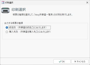 | PDF出力 | 現在画面表示されているAssy所要量の計算結果を帳票形式でPDFファイルに出力します。部品別/購入先別の選択などの操作は[印刷]ボタンと同様です。![]() |