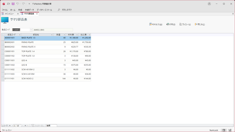 2. 製品コードを選択することによって、その製品に関する部品のサマリ形式のデータが一覧表示されます。