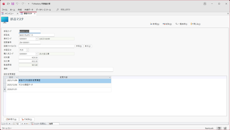 その部品の設計変更履歴に関して、「日付」と「変更内容」を入力します。1つの部品について、事実上無制限の履歴を入力することができます。