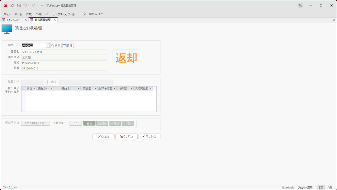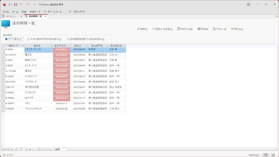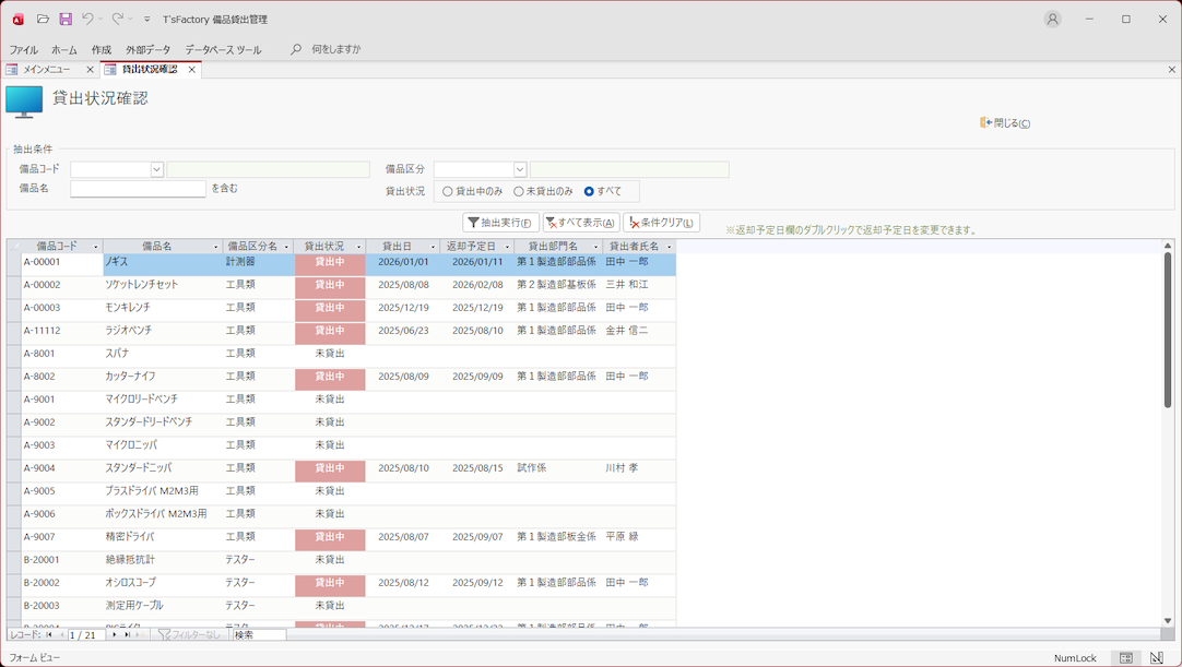 工場内にどんな備品類があり、今どの部門の誰に貸し出しているか、そしていつまでに返却されるかをパソコンで管理することができます。