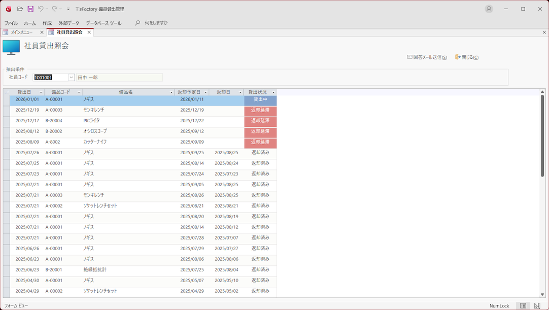 社員からの貸出状況照会に即座に対応することができます。社員コードを入力するだけでその社員の貸出状況を確認することができます。さらにその問い合わせに関して、未返却の備品に関する情報をメールで回答することもできます。