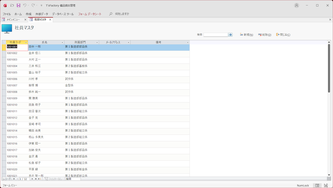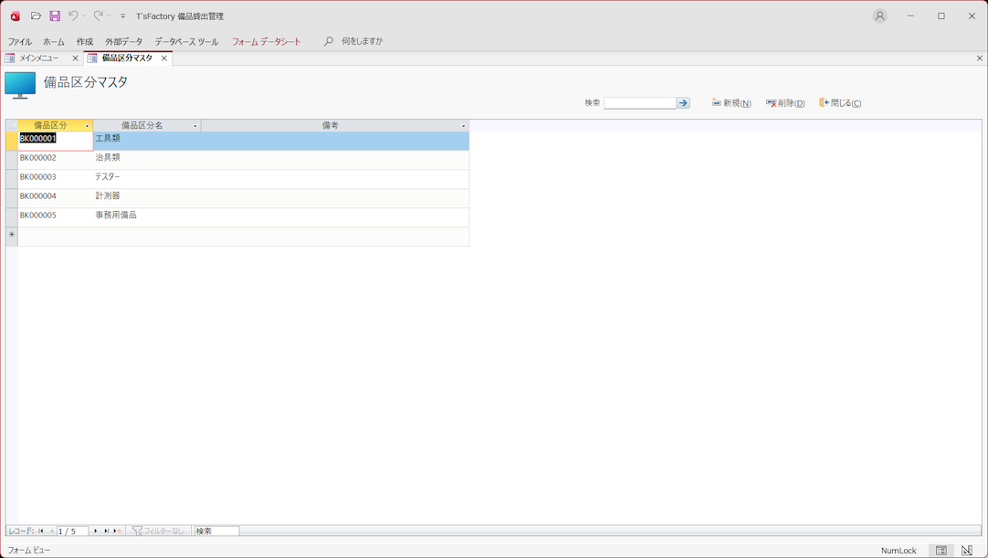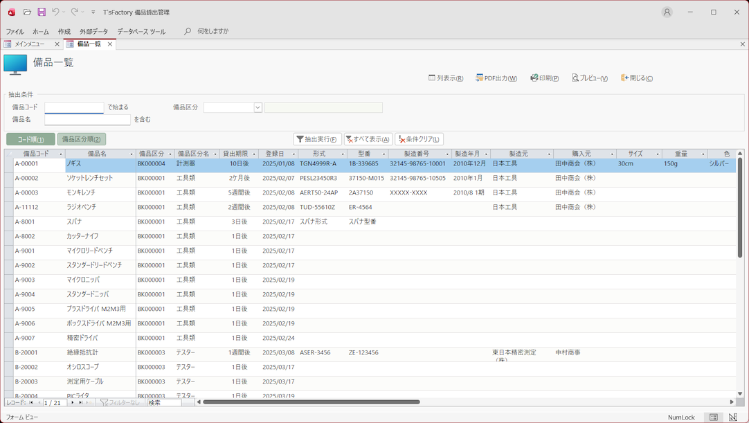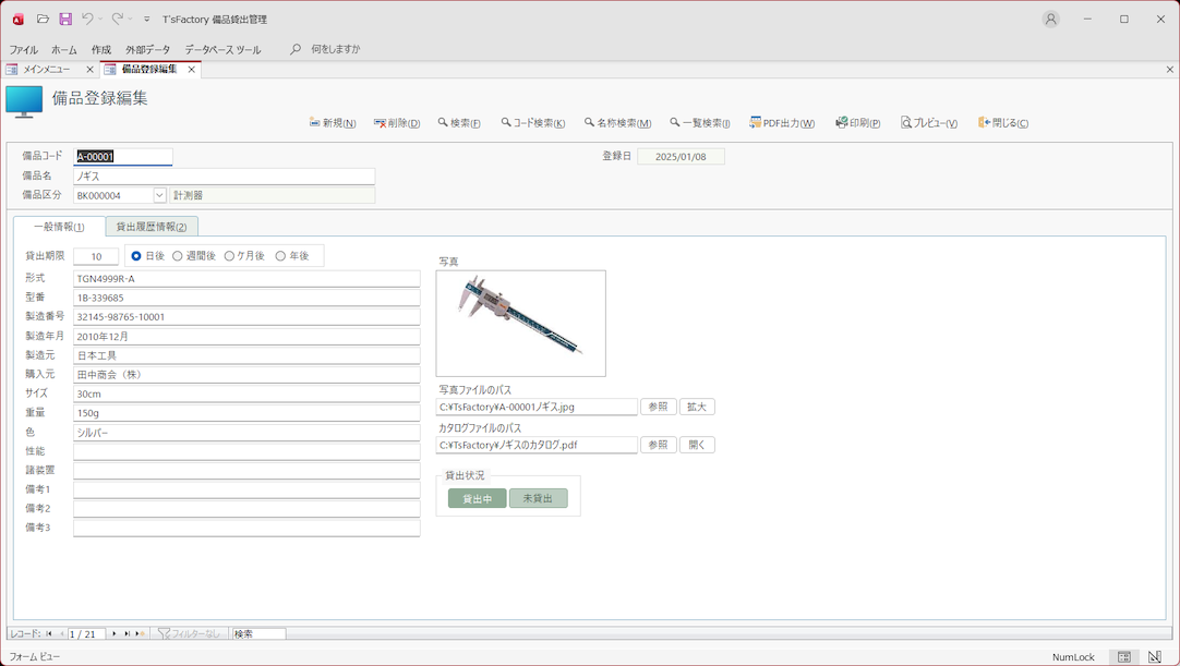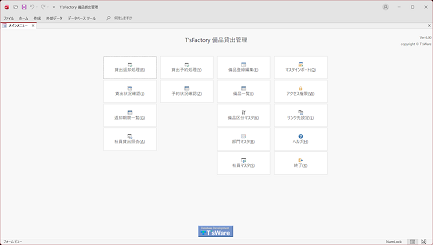 本アプリケーションは、工場内や事務所内で使われるさまざまな備品、治工具、計測器/テスター類の個体の管理、およびその貸出・返却の管理を一元的に行うためのデータベースアプリケーションです。