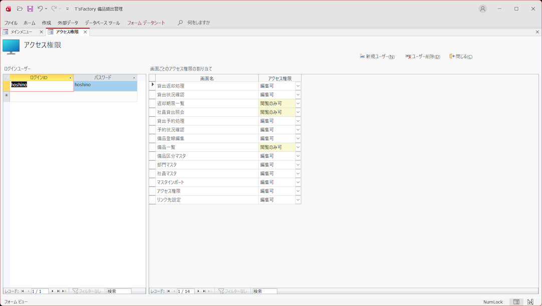 ユーザーごと・画面ごとに編集可/閲覧のみ可/使用不可の3種類のアクセス権限を設定・管理することができます。