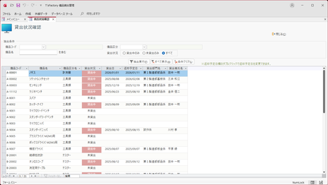 各備品が未貸出で保管中かあるいは貸出中か、その状況を一覧表示する画面です。いくつかの特定の条件でデータを抽出することもできます。
