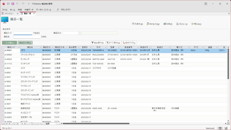 - まず、この画面を開くと、「備品登録編集」画面で入力したデータが一覧表示されます(一部表示されないデータ項目もあります)。これらを細かく確認したい場合には特に操作はありません。画面をスクロールすることによって、個々のデータを閲覧してください。