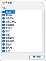 備品の一覧に表示されているデータ項目はかなり多いため、すべてのデータを見るには画面を左右にスクロールさせる必要があります。そこでこのボタンをクリックすると、一覧画面に表示するデータ項目をマウスのクリックだけで絞り込むことができます。