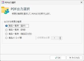 | PDF出力 | 各種の「備品一覧表」をPDFファイルに出力します。帳票選択などの操作は[印刷]ボタンと同様です。![]() |